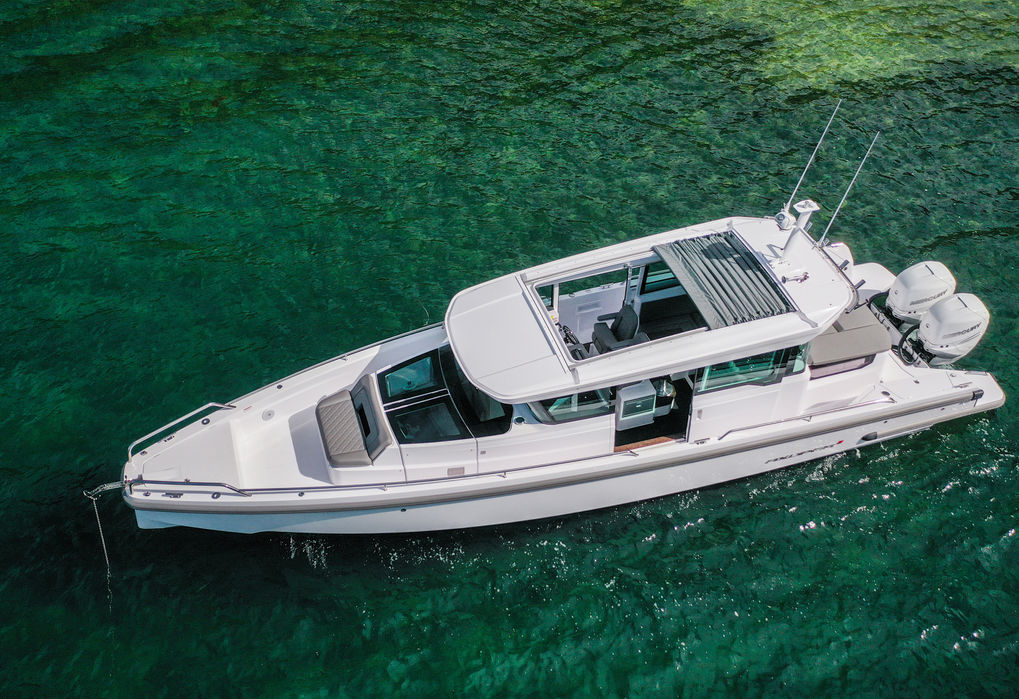 Our Axopar 37 sun top yacht, is open with a retractable sun top that offers full protection from the sun.
